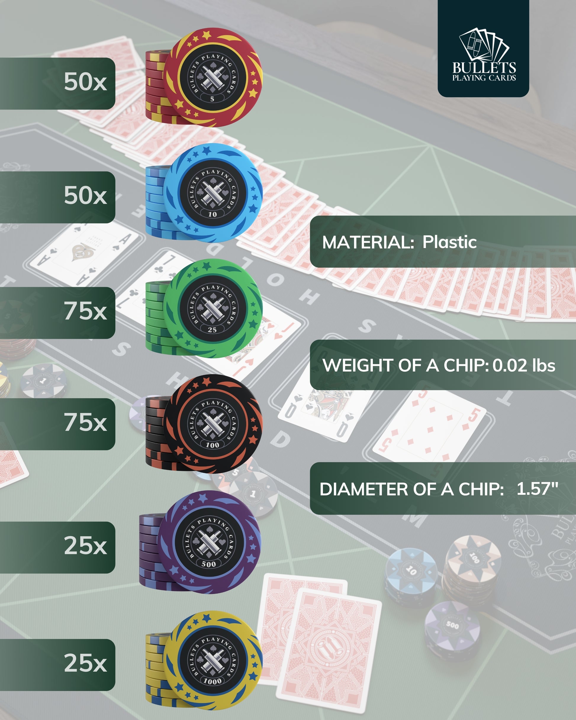Contents: 300 plastic poker chips, ceramic dealer button, 2 decks of Bullets plastic poker cards, 5 dice, poker rules